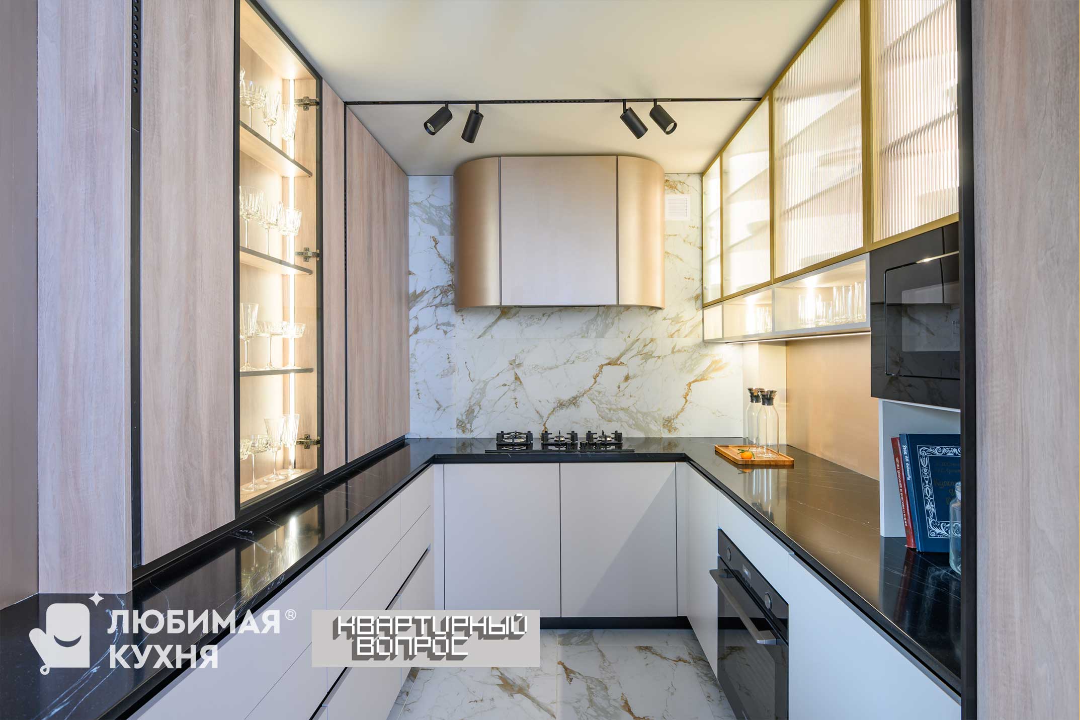 Рисунок мрамора с живописными прожилками называется Creamy Pie, Сливочный пирог — запустим и на кухонный фартук. Для удобства укладки по нижней линии закрепили профиль, он не дает тяжелым плитам сползать.