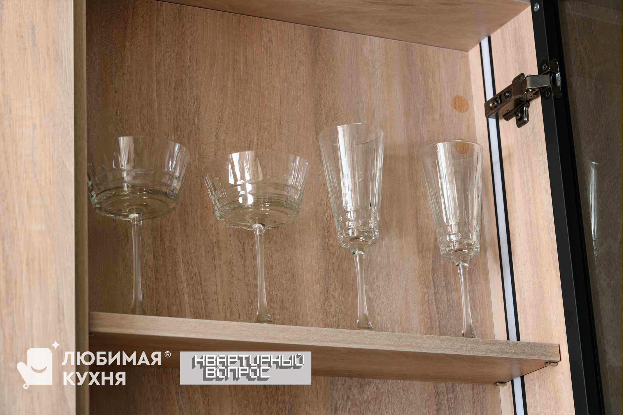 фасады ТРП Монолит беж, фреза Модерн, алюминиевая рамка Золото, стекло Тренд Вирджиния