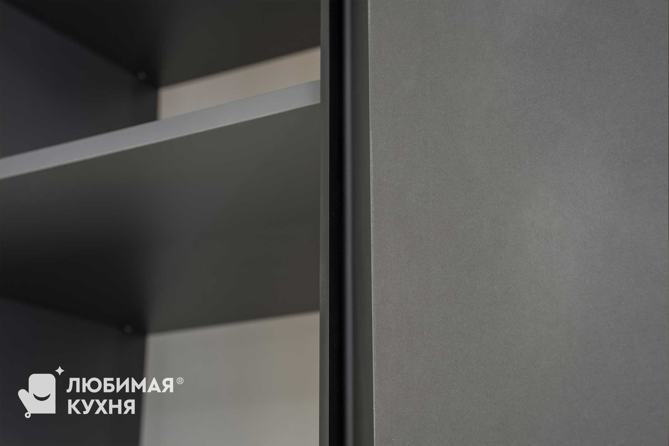Шикарная кухня для ценителей сложных текстур, цветовых сочетаний и внимательных к деталям. Небольшая зона с мойкой, совмещенная с невероятно вместительными пеналами, в которых разместились полки для хранения различной утвари, от кофемашины, до столовых приборов и колонны со встроенной техникой. Композицию завершает большой и вместительный остров, с одной стороны которого предусмотрена зона готовки с варочной панелью, а с другой зона приема пищи и отдыха.