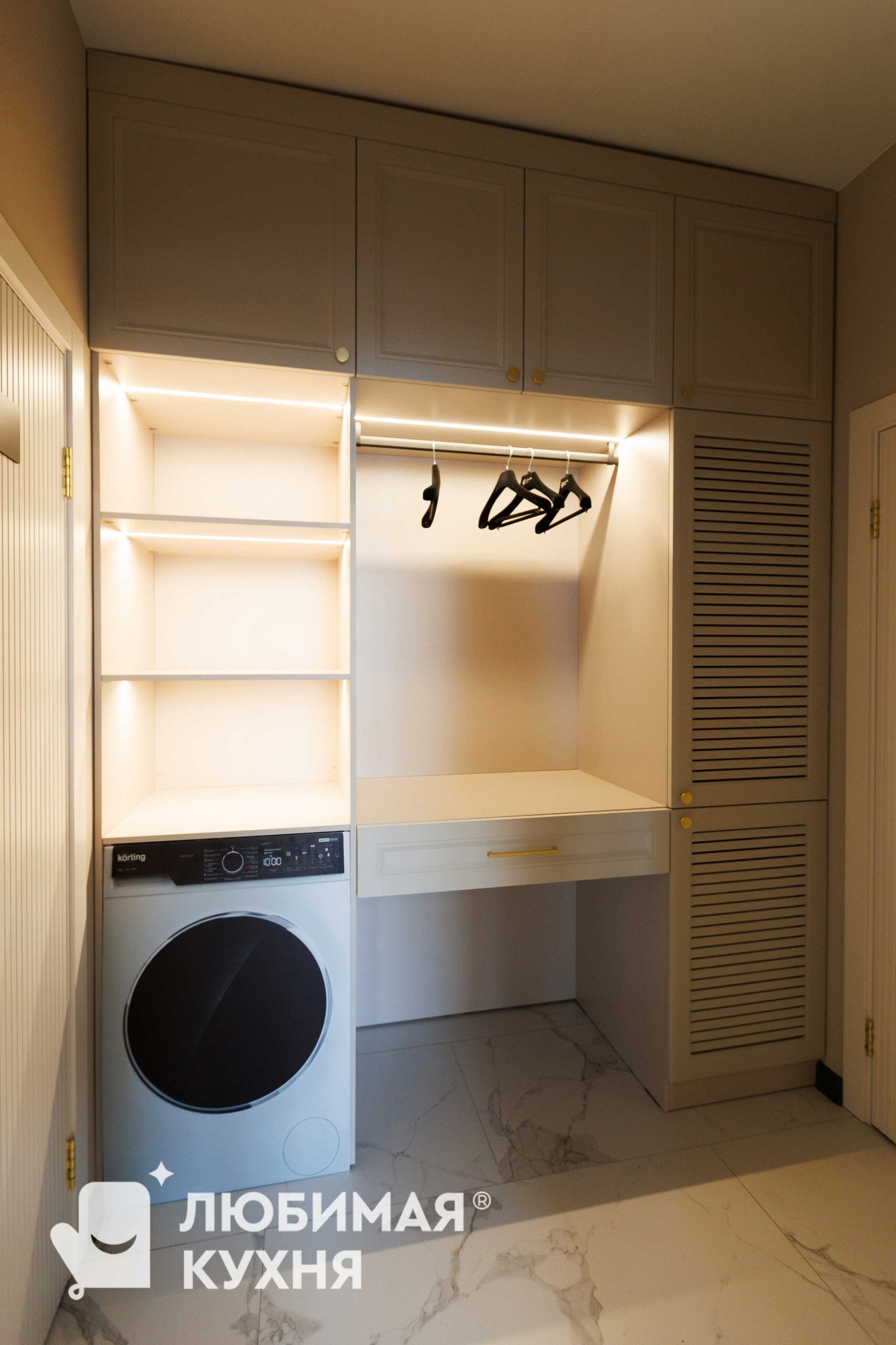 Функциональная мебель для постирочной в элегантном серо-юежевом оттенке с рифлеными фасадами. Компактная система объединяет зону стирки со встроенной стиральной машиной, открытые полки с подсветкой для хранения средств, выдвижной ящик и вешалку для сушки белья. Жалюзийные фасады на правой стороне обеспечивают вентиляцию, а золотистые ручки и фурнитура добавляют изысканности. Продуманное освещение делает пространство удобным для использования в любое время суток.
